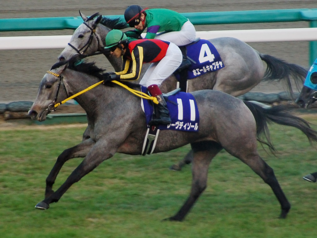勝負所、ダンスファンタジアが先頭に並びかけてきます。しかし、直線に入ると思ったより伸びず後退していきます。好位にいたツルマルワンピースとライステラスが、先頭に立ちます。更に内から馬群を割ってホエールキャプチャ、そして大本命・レーヴディソールが外から鋭い脚で一気に伸びてきて、4頭の争いになります。しかし、レーヴディソールの勢いは素晴らしく、ホエールキャプチャ、ライステラスらを差し切って半馬身差快勝しました。芦毛馬によるワンツースリーと史上初の出来事となりました。アヴェンチュラが後方からよく伸びて4着、ツルマルワンピースが5着になりました。