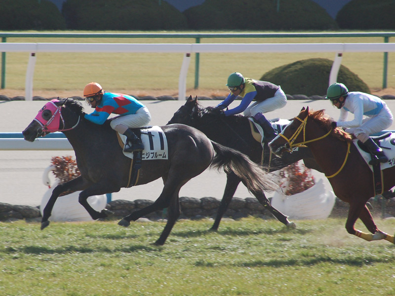 直線、外のコティリオンが楽な感じで先頭に立ちます。しかし、突き放すかと思ったのですが、最後方からレースを進めていたニジブルームが外から襲い掛かり、コティリオンをあっさり交わして抜け出します。更に後ろからギリギリヒーローが伸びてきて、最後はこの2頭が並んでゴール。ニジブルームが僅かにクビ差勝利しました。